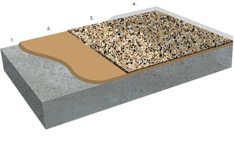 Third is a full layer of decorative chips. The chips are broad-cast for even and full coverage. Full range of colors available.