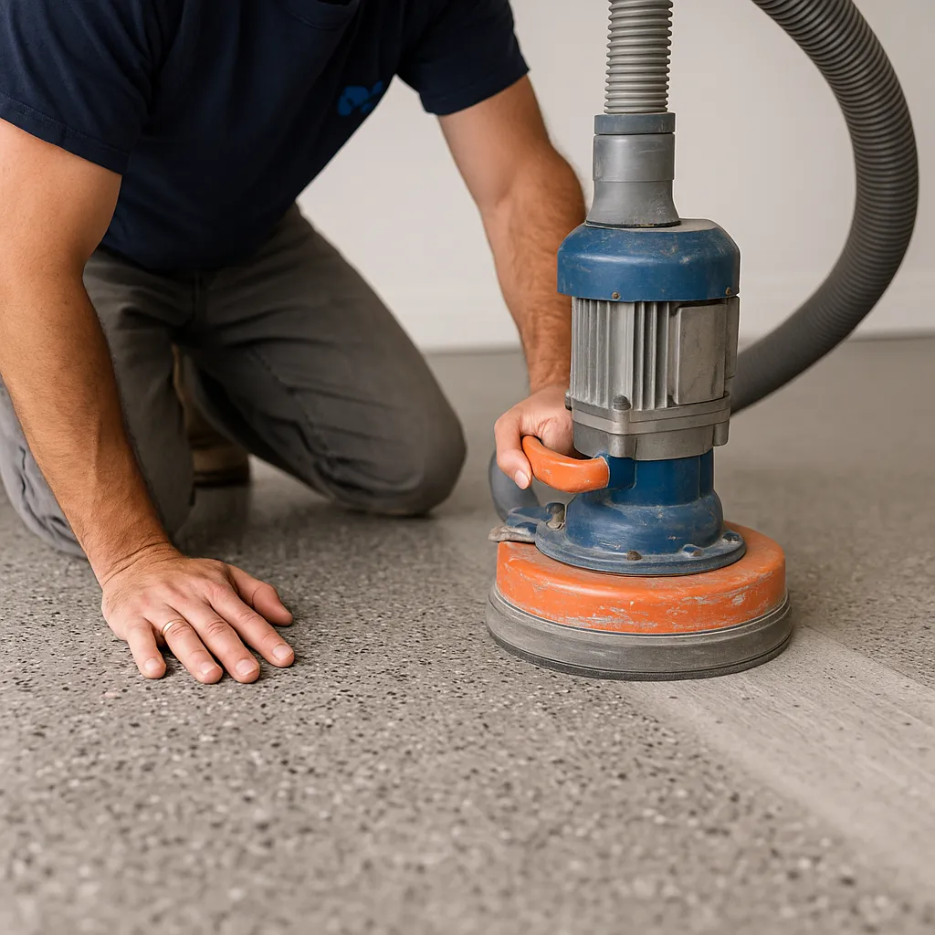Cracks and seams are filled and the whole floor is diamond grinded to smooth the surface & for superior adhesion in the second step.